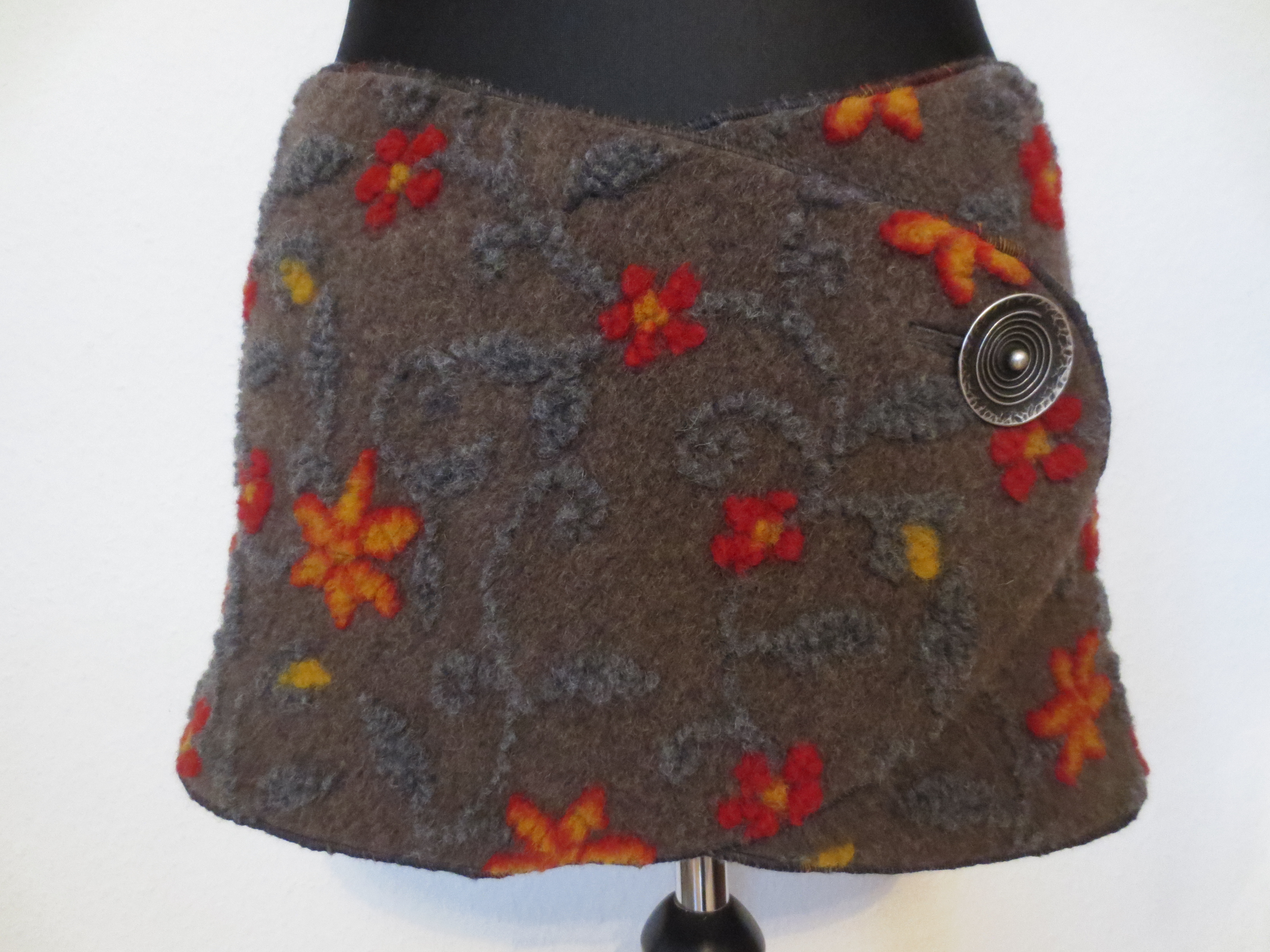 Der Mantel ist auf dem Bild mit braunem Untergrund und roten, orangen Blumen sowie grauer Ranke erhältlich!