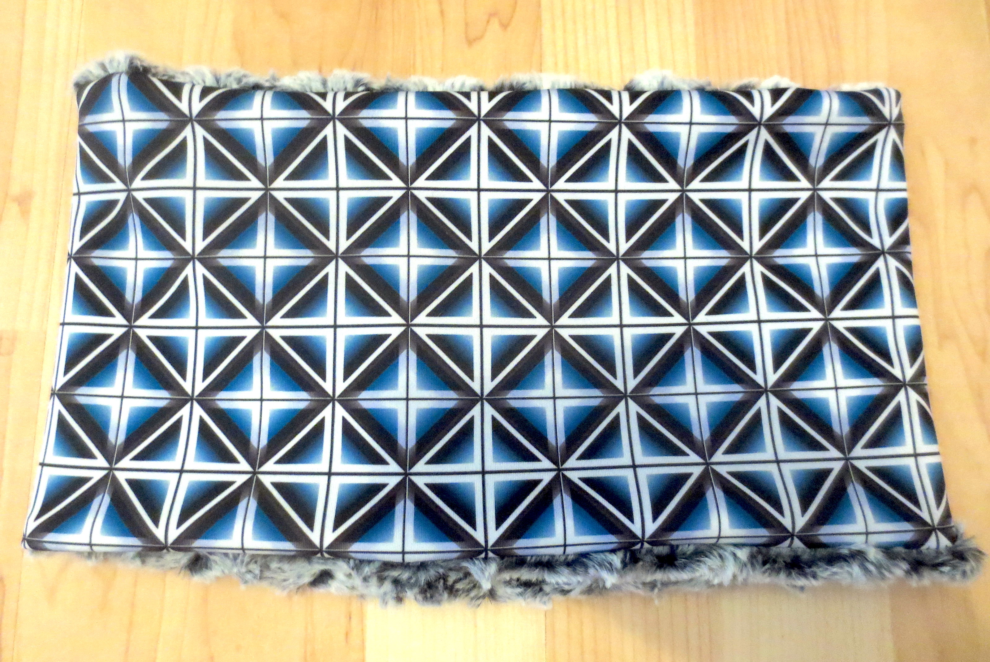 Stoffmaterial: 100% Polyester, Farbe weiss, Fellimitat 196% Polyester, 4% Elasthan, schwarz - blau - weiss Muster Grösse: Länge 64 cm, Breite /Höhe 17 cm